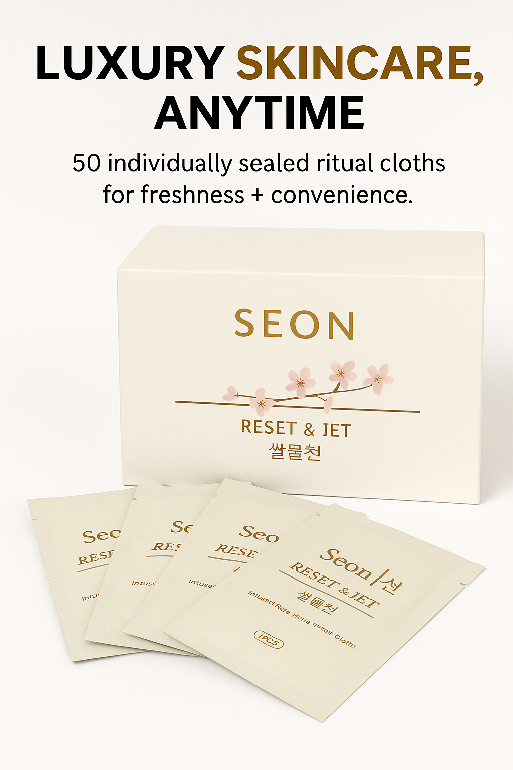 Refresh your skin anytime, anywhere. SEON's Reset & Jet Ritual Cloths are infused with Korean rice water, and a proprietary blend of gentle cleansers to cleanse, nourish, and restore your natural glow.